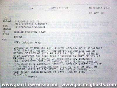 CREW SURVIVED AND LOSS ONLY RECORDED IN UNIT OR 5TH AF RECORDS. UNIT HISTORIES OF 19TH BOMB GP. PROBABLY AIR UNIVERSITY (HOR) AT MAXWELL AFB, ALABAMA. PHOTOS HAVE BEEN SENT AIRCRACFT MUSEUM - GETTING ADDITIONAL SET COLOR PRINTS IN CANBERRA AND WILL FORWARD TO YOU. NO PERSONAL ARTCLES RECOVERED. PAO PETTUS PROMER C.O.